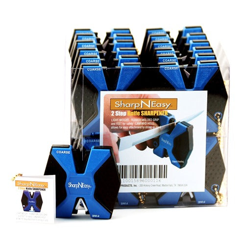 The 2-Step Sharpener also has over-molded grips. The over-molding process allows the user to have a comfortable and secure grip while sharpening. The unit has a lanyard hole which allows for easy attachment to cord or string. Available carded or in a 24-Piece Counter Display.